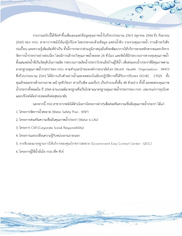 กปภ.สาขาปากพนัง ได้ดำเนินการโครงการต่าง ๆ เพื่อส่งเสริมความเชื่อมั่นคุณภาพน้ำประปา ประจำปีงบประมาณ 2565
