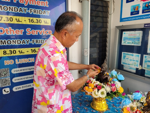 วันอังคารที่ 11 เมษายน 2566 กปภ.สาขากาญจนบุรี นำโดย นายพิชัย พันธุ์อร่าม ผจก.กปภ.สาขากาญจนบุรี พร้อมด้วย นายประเสริฐ เสลาหอม ผู้ช่วยผู้จัดการ หัวหน้างาน และพนักงานในสังกัด จัดกิจกรรมสรงน้ำ ขอพรพระพุทธรูปประจำสำนักงาน และองค์พระแม่ธรณี เนื่องในโอกาสเทศกาลวันสงกรานต์ (วันขึ้นปีใหม่ไทย) ซึ่งการดำเนินกิจกรรมนี้ เป็นการเสริมความเป็นสิริมงคลและเสริมโชคลาภทั้งด้านการงานและการเงิน สร้างความสุขและกำลังใจ ปกปักรักษาคุ้มครอง ให้กับพนักงานทุกคน