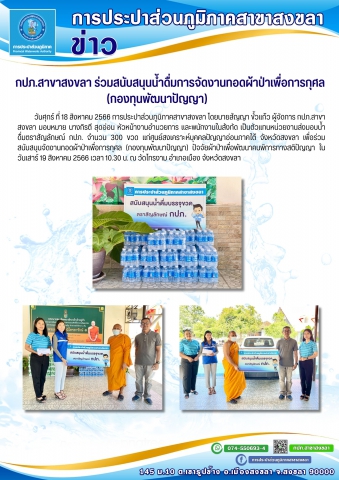 เมื่อวันศุกร์ ที่ 18 สิงหาคม 2566 การประปาส่วนภูมิภาคสาขาสงขลา โดยนายสัญญา ขั้วแก้ว ผู้จัดการ กปภ.สาขาสงขลา มอบหมาย นางกิรตี สุดอ่อน หัวหน้างานอำนวยการ และพนักงานในสังกัด เป็นตัวแทนหน่วยงานส่งมอบน้ำดื่มตราสัญลักษณ์ กปภ. จำนวน 300 ขวด แก่ศูนย์สงเคราะห์บุคคลปัญญาอ่อนภาคใต้ จังหวัดสงขลา เพื่อร่วมสนับสนุนจัดงานทอดผ้าป่าเพื่อการกุศล (กองทุนพัฒนาปัญญา) ปัจจัยผ้าป่าเพื่อพัฒนาคนพิการทางสติปัญญา