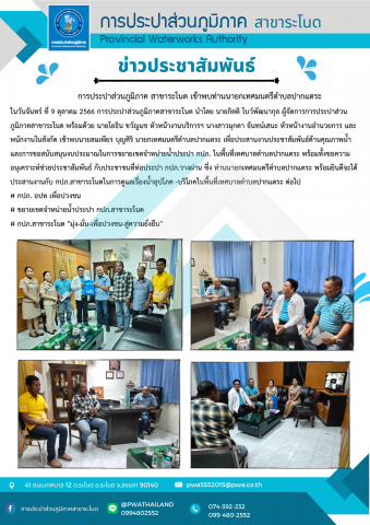 ในวันจันทร์ ที่ 9 ตุลาตม 2566 การประปาส่วนภูมิภาคสาขาระโนด นำโดย นายกิตติ โบว์พัฒนากุล ผู้จัดการการประปาส่วนภูมิภาคสาขาระโนด
