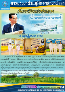 วันอังคาร ที่ 14 พฤศจิกายน พ.ศ. 2566 (เวลา 07.30 น.) การประปาส่วนภูมิภาคสาขาพังงา นำโดย นายเลอศักดิ์ รัตนฉายา ผู้จัดการการประปาส่วนภูมิภาคสาขาพังงา มอบหมายให้หัวหน้างานผลิตและพนักงานในสังกัด ร่วมพิธีวางพานพุ่มดอกไม้สด เนื่องในวัน พระบิดาแห่งฝนหลวง ณ หอประชุมจำปูน ศูนย์ราชการจังหวัดพังงา ตำบลถ้ำน้ำผุด อำเภอเมืองพังงา จังหวัดพังงา เพื่อน้อมรำลึกในพระมหากรุณาธิคุณอันหาที่สุดมิได้ของพระบามสมเด็จพระบรมชนกาธิเบศร มหาภูมิพลอดุลยเดชมหาราช บรมนาถบพิตร โดยมีนายสุพจน์ รอดเรือง ณ หนองคาย ผู้ว่าราชการจังหวัดพังงา เป็นประธานในพิธี