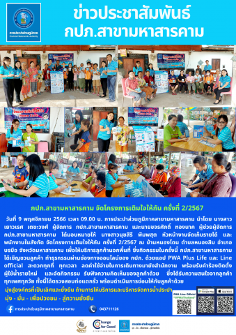 วันที่ 9 พฤศจิกายน 2566 เวลา 09.00 น. การประปาส่วนภูมิภาคสาขามหาสารคาม นำโดย นางสาวเยาวเรศ เตชะวงศ์ ผู้จัดการ กปภ.สาขามหาสารคาม และนายขจรศักดิ์ ทองนาค ผู้ช่วยผู้จัดการ กปภ.สาขามหาสารคาม ได้มอบหมายให้ นางสาวนุชสิรี พิมพสุต หัวหน้างานจัดเก็บรายได้ และพนักงานในสังกัด จัดโครงการเติมใจให้กัน ครั้งที่ 2/2567ณ บ้านหนองโดน ตำบลหนองสิม อำเภอบรบือ จังหวัดมหาสารคาม เพื่อให้บริการลูกค้านอกพื้นที่ ซึ่งกิจกรรมในครั้งนี้ กปภ.สาขามหาสารคาม ได้เชิญชวนลูกค้า ทำธุรกรรมผ่านช่องทางออนไลน์ของ กปภ. ด้วยแอป PWA Plus Life และ Line official สะดวกทุกที่ ทุกเวลา ลดค่าใช้จ่ายในการเดินทางมายังสำนักงาน พร้อมรับคำร้องติดตั้งผู้ใช้น้ำรายใหม่และจัดกิจกรรม รับฟังความคิดเห็นของลูกค้าด้วยซึ่งได้รับความสนใจจากลูกค้าทุกเพศทุกวัย ทั้งนี้ได้ตรวจสอบท่อแตกรั่ว พร้อมดำเนินการซ่อมให้กับลูกค้าด้วย