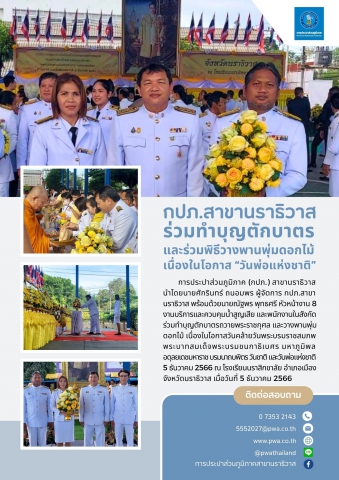 กปภ.สาขานราธิวาส ร่วมทำบุญตักบาตรและวางพานพุ่มดอกไม้ เนื่องในโอกาส “วันพ่อแห่งชาติ”