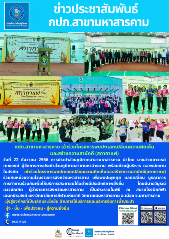วันที่ 22 ธันวาคม 2566 การประปาส่วนภูมิภาคสาขามหาสารคาม นำโดย นางสาวเยาวเรศ เตชะวงศ์ ผู้จัดการการประปาส่วนภูมิภาคสาขามหาสารคาม พร้อมด้วยผู้บริหาร และพนักงานในสังกัด เข้าร่วมโครงการพบปะแลกเปลี่ยนความคิดเห็นและสร้างความสามัคคี(สภากาแฟ) ร่วมกับหน่วยงานส่วนราชการจังหวัดมหาสารคาม เพื่อพบปะพูดคุย แลกเปลี่ยน บูรณาการการทำงานร่วมกันเพื่อให้บริการประชาชนได้อย่างมีประสิทธิภาพยิ่งขึ้น โดยมีนายวิบูรณ์ แววบัณฑิต ผู้ว่าราชการจังหวัดมหาสารคาม เป็นประธานในพิธี ณ สนามโรงฝึกกีฬาเอนกประสงค์ มหาวิทยาลัยการกีฬาแห่งชาติ วิทยาเขตมหาสารคาม อ.เมือง จ.มหาสารคาม