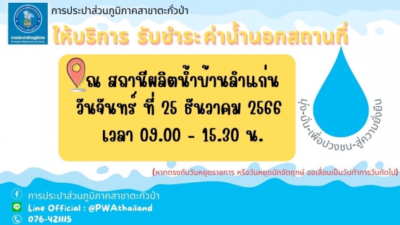 วันจันทร์ ที่ 25 ธันวาคม 2566 นายธำรง คุ้มเพชร ผู้จัดการการประปาส่วนภูมิภาคสาขาตะกั่วป่า ได้มอบหมายให้นางสาวอลิสรา ชัยกิจ หัวหน้างาน 8 งานอำนวยการ และพนักงานในสังกัด ให้บริการรับชำระค่าน้ำประปา และรับคำขอติดตั้งประปานอกสถานที่ ทุกวันที่ 25 ของเดือน (หากตรงกับวันหยุดราชการหรือวันหยุดนักขัตฤกษ์ขอเลื่อนเป็นวันทำการวันถัดไป) ณ สถานีผลิตน้ำบ้านลำแก่น ซึ่งเป็นการเพิ่มช่องทางการชำระเงินค่าน้ำ ลดเวลาและค่าใช้จ่ายสร้างความสะดวกให้กับลูกค้ามากยิ่งขึ้น และเพื่อลดหนี้ค้างชำระของสาขาตะกั่วป่า ตั้งแต่เวลา 09.00 - 15.30 น. ทั้งนี้ได้จัดกิจกรรมแจกของที่ระลึกให้แก่ลูกค้าที่ลงทะเบียนไลน์ @pwathailand เพื่ออำนวยความสะดวกให้ลูกค้าในการชำระค่าน้ำประปาผ่านช่องทางออนไลน์อีกด้วย