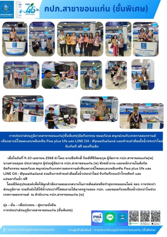 เมื่อในวันที่ 9-10 เมษายน 2568 นำโดย นายธีรศักดิ์ กิตติศิริวัฒนกุล ผู้จัดการ กปภ.สาขาขอนแก่น(พ) นางสาวนฤมล ประภาสมุทร ผู้ช่วยผู้จัดการ กปภ.สาขาขอนแก่น (พ) หัวหน้างาน เเละพนักงานในสังกัด จัดกิจกรรม หมดกังวล สนุกม่วนกับเทศกาลสงกรานต์เพียงดาวน์โหลดเเอบพลิเคชัน Pwa plus life เเละ LINE OA : @pwathailand รวมถึงการชำระค่าติดตั้งน้ำประปาใหม่ รับทันทีกระเป๋าโทรศัพท์ เเละ แว่นตากันน้ำ ฟรี
