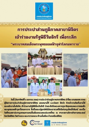 วันอาทิตย์ที่ 6 เมษายน 2568 การประปาส่วนภูมิภาคสาขาพิจิตร นำโดย นายสมเจต กาหล ผู้จัดการการประปาส่วนภูมิภาคสาขาพิจิตร มอบหมายให้ น.ส.นิยดา ฟักบัว หัวหน้างานจัดเก็บรายได้ และพนักงานในสังกัด เข้าร่วมงานรัฐพิธีเนื่องวันจักรี ร่วมระลึกถึงพระมหากรุณาธิคุณของพระบาทสมเด็จพระพุทธยอดฟ้าจุฬาโลกมหาราช ซึ่งเป็นพระปฐมกษัตริย์ของราชวงศ์จักรีแห่งกรุงรัตนโกสินทร์ และเป็นวันที่ทรงสถาปนากรุงเทพมหานครเป็นเมืองหลวงของประเทศไทย ณ ศาลาสภาบริหารกิจการคณะสงฆ์จังหวัดพิจิตร วัดท่าหลวง พระอารามหลวง ตำบลในเมือง อำเภอเมืองพิจิตร