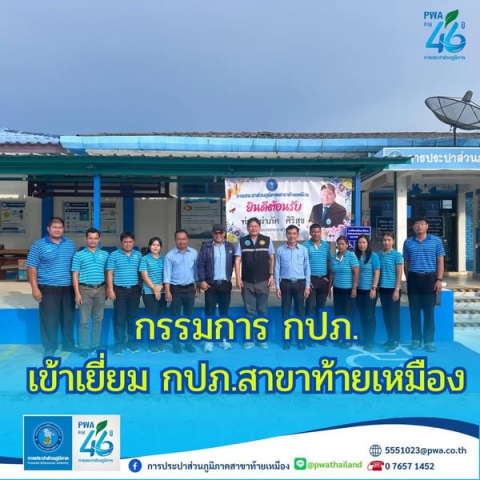 ในวันที่ 22 เมษายน 2568 ภายใต้การบริหารงานโดยนายนพดล จันทร์จำปา หัวหน้างาน 8 รักษาการในตำแหน่ง ผจก.กปภ.สาขาท้ายเหมือง พร้อมด้วยนายสุทธิพงศ์ บุญสา หัวหน้างานผลิต , นายปริญญา นวลมี หัวหน้างานบริการฯ /พนักงานและลูกจ้างในสังกัด ร่วมให้การต้อนรับ ท่านเผ่าภัค ศิริสุข กรรมการการประปาส่วนภูมิภาค และคณะผู้บริหารกปภ.ข.4 ,นายกิตติศักดิ์ เกื้อกาญจน์ ผู้ช่วยผู้อำนวยการ กปภ.ข.4 (บริหาร), นายโกวิทย์ เพชรเศรษฐ ผู้อำนวยการกองบัญชีและการเงิน เนื่องในโอกาสเข้าตรวจเยี่ยม กปภ.สาขาท้ายเหมือง อย่างอบอุ่น ในการนี้ ท่านเผ่าภัค ศิริสุข กรรมการการประปาส่วนภูมิภาค และคณะผู้บริหาร กปภ.ข.4 ได้เข้าตรวจเยี่ยมแหล่งน้ำดิบขุมเหมืองห้วยกร้าง, สำรวจสภาพบ้านพักของพนักงานกปภ. พร้อมร่วมรับฟังบรรยายสรุป ณ สำนักงาน กปภ.สาขาท้ายเหมืองโดยท่านได้ให้คำแนะนำ และวิธีการดำเนินการแก้ไขปัญหาในทุก ๆ ด้าน ไว้สำหรับเป็นแนวทางการปฏิบัติหน้าที่ และเพื่อเป็นขวัญและกำลังใจให้กับพนักงานในการมุ่งมั่นผลิตน้ำประปา เพื่อให้พี่น้องประชาชนได้มีน้ำประปาที่ใสสะอาดสำหรับอุปโภคและบริโภคสืบต่อไป