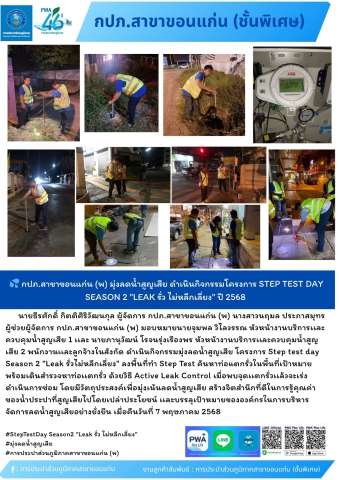 นายธีรศักดิ์ กิตติศิริวัฒนกุล ผู้จัดการ กปภ.สาขาขอนแก่น (พ) นางสาวนฤมล ประภาสมุทร ผู้ช่วยผู้จัดการ กปภ.สาขาขอนแก่น (พ) มอบหมายนายจุมพล วิไลวรรณ หัวหน้างานบริการเเละควบคุมน้ำสูญเสีย 1 เเละ นายภานุวัฒน์ โรจนรุ่งเรืองพร หัวหน้างานบริการเเละควบคุมน้ำสูญเสีย 2 พนักงานเเละลูกจ้างในสังกัด ดำเนินกิจกรรมมุ่งลดน้ำสูญเสีย โครงการ Step test day Season 2 "Leak รั่วไม่หลีกเลี่ยง" ลงพื้นที่ทำ Step Test ค้นหาท่อแตกรั่วในพื้นที่เป้าหมาย พร้อมเดินสำรวจหาท่อเเตกรั่ว ด้วยวิธี Active Leak Control เมื่อพบจุดเเตกรั่วเเล้วจะเร่งดำเนินการซ่อม โดยมีวัตถุประสงค์เพื่อมุ่งเน้นลดน้ำสูญเสีย สร้างจิตสำนึกที่ดีในการรู้คุณค่าของน้ำประปาที่สูญเสียไปโดยเปล่าประโยชน์ เเละบรรลุเป้าหมายขององค์กรในการบริหารจัดการลดน้ำสูญเสียอย่างยั่งยืน เมื่อคืนวันที่ 7 พฤษภาคม 2568
