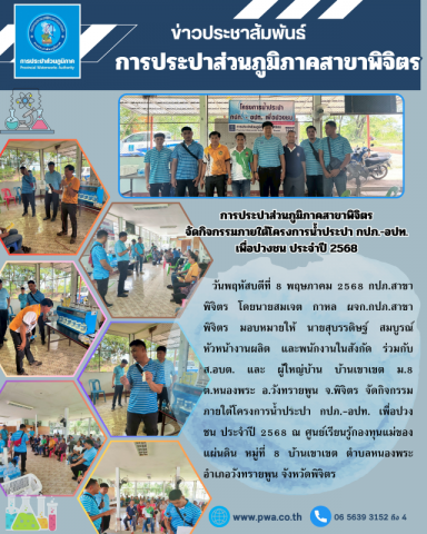 วันพฤหัสบดีที่ 8 พฤษภาคม 2568 กปภ.สาขาพิจิตร โดยนายสมเจต กาหล ผจก.กปภ.สาขาพิจิตร มอบหมายให้ นายสุบรรดิษฐ์ สมบูรณ์ หัวหน้างานผลิต และพนักงานในสังกัด
