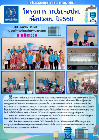 วันที่ 30 เมษายน 2568 การประปาส่วนภูมิภาคสาขาพยุหะคีรี โดยนายอำนวยวิทย์ พร้อมวงศ์ ผจก.สาขาพยุหะคีรี ได้มอบหมายให้หัวหน้างานและพนักงานในสังกัด ดำเนินโครงการ กปภ. - อปท. เพื่อปวงชน ให้ความรู้เกี่ยวกับมาตรฐานระบบน้ำประปา การตรวจสอบคุณาภาพน้ำ อบรมวิชาการประปา ให้กับ องค์การบริหารส่วนตำบลยางตาล อ.โกรกพระ จ.นครสวรรค์ จัดกิจกรรมดังกล่าว ณ องค์การบริการส่วนตำบลยางตาล
