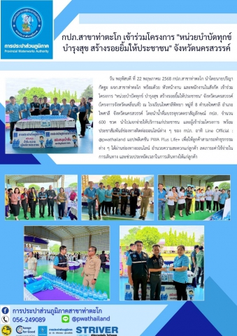 วันพฤหัสบดี ที่ 22 พฤษภาคม 2568 กปภ.สาขาท่าตะโก นำโดยนายปริญา กัตฐะ ผจก.สาขาท่าตะโก พร้อมด้วย หัวหน้างาน และพนักงานในสังกัด เข้าร่วมโครงการ "หน่วยบำบัดทุกข์ บำรุงสุข สร้างรอยยิ้มให้ประชาชน" จังหวัดนครสวรรค์ (โครงการจังหวัดเคลื่อนที่) ณ โรงเรียนไพศาลีพิทยา หมู่ที่ 8 ตำบลไพศาลี อำเภอไพศาลี จังหวัดนครสวรรค์ โดยนำน้ำดื่มบรรจุขวดตราสัญลักษณ์ กปภ. จำนวน 600 ขวด นำไปแจกจ่ายให้บริการแก่ประชาชน และผู้เข้าร่วมโครงการ พร้อมประชาสัมพันธ์ช่องทางติดต่อออนไลน์ต่าง ๆ ของ กปภ. อาทิ Line Official : @pwathailand แอปพลิเคชัน PWA Plus Life+ เพื่อให้ลูกค้าสามารถทำธุรกรรมต่าง ๆ ได้ผ่านช่องออนไลน์ อำนวยความสะดวกแก่ลูกค้า ลดภาระค่าใช้จ่ายในการเดินทาง และช่วยประหยัดเวลาในการเดินทางให้แก่ลูกค้า