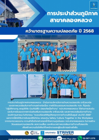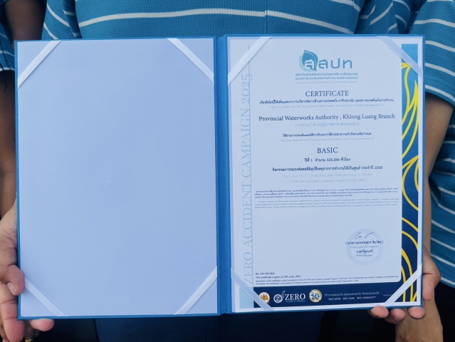 การประปาส่วนภูมิภาคสาขาคลองหลวง ดำเนินการบริหารจัดการด้านความปลอดภัย อาชีวอนามัย และสภาพแวดล้อมในการทำงานอย่างต่อเนื่อง ภายใต้วัฒนธรรมความปลอดภัย กปภ. ที่มุ่งเน้น "ปฏิบัติตามกฎ ลดอุบัติภัย ร่วมกันใส่ใจ ปลอดภัยเมื่อทำงาน" กปภ.สาขาคลองหลวง ได้ผ่านการประเมินและรับการรับรองจากสถาบันส่งเสริมความปลอดภัย อาชีวอนามัย และสภาพแวดล้อมในการทำงาน (องค์การมหาชน) ในกิจกรรม "รณรงค์ลดสถิติอุบัติเหตุจากการทำงานให้เป็นศูนย์ ประจำปี 2568" นอกจากนี้ยังได้รับการรับรองให้เข้าร่วม แคมเปญ Safety Culture Together in the Workplace จากกระทรวงแรงงาน ความสำเร็จดังกล่าวตอกย้ำถึงความมุ่งมั่นของ กปภ.สาขาคลองหลวง ในการสร้างวัฒนธรรมความปลอดภัย ลดความเสี่ยง และพัฒนาสภาพแวดล้อมการทำงานที่ปลอดภัย เพื่อสร้างความมั่นใจให้แก่ทั้งพนักงานและผู้รับบริการอย่างยั่งยืน