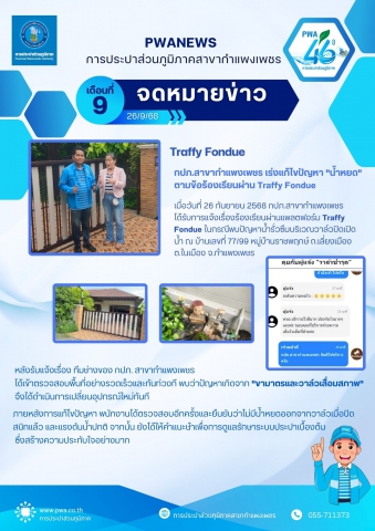 เมื่อวันที่ 26 กันยายน 2568 กปภ.สาขากำแพงเพชร ได้รับการแจ้งเรื่องร้องเรียนผ่านแพลตฟอร์ม Traffy Fondue ในกรณีพบปัญหาน้ำรั่วซึมบริเวณวาล์วปิดเปิดน้ำ ณ บ้านเลขที่ 77/99 หมู่บ้านราชพฤกษ์ ถ.เลี่ยงเมือง ต.ในเมือง จ.กำแพงเพชร