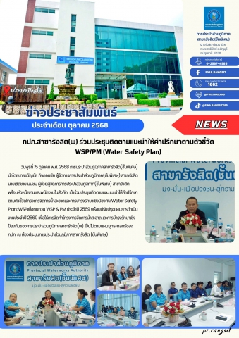 วันพุธที่ 15 ตุลาคม พ.ศ. 2568 การประปาส่วนภูมิภาคสาขารังสิต(ชั้นพิเศษ) นำโดยนายขวัญชัย กิจกอบชัย ผู้จัดการการประปาส่วนภูมิภาค(ชั้นพิเศษ) สาขารังสิต นายเชิดชาย มนชม ผู้ช่วยผู้จัดการการประปาส่วนภูมิภาค(ชั้นพิเศษ) สาขารังสิต พร้อมหัวหน้างานและพนักงานในสังกัด เข้าร่วมประชุมติดตามและแนะนำให้คำปรึกษาตามตัวชี้วัดโครงการจัดการน้ำสะอาดและการบำรุงรักษาเชิงป้องกัน Water Safety Plan: WSPเพื่อทบทวน WSP & PM ประจำปี 2569 พร้อมปรับปรุงแผนการดำเนินงานประจำปี 2569 เพื่อให้การจัดทำโครงการจัดการน้ำสะอาดและการบำรุงรักษาเชิงป้องกันของการประปาส่วนภูมิภาคสาขารังสิต(พ) เป็นไปตามแผนยุทธศาสตร์ของ กปภ. ณ ห้องประชุมการประปาส่วนภูมิภาคสาขารังสิต (ชั้นพิเศษ)