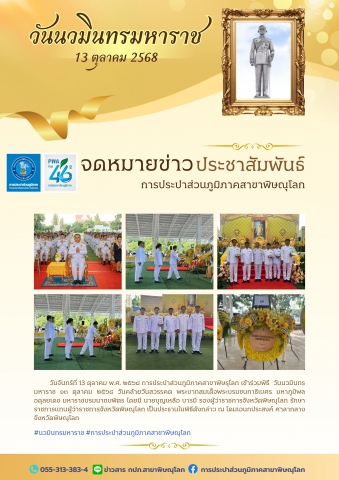 วันจันทร์ที่ 13 ตุลาคม 2568 การประปาส่วนภูมิภาคสาขาพิษณุโลก เข้าร่วมพิธี วันนวมินทรมหาราช 13 ตุลาคม 2568 วันคล้ายวันสวรรคต พระบาทสมเด็จพระบรมชนกาธิเบศร มหาภูมิพล อดุลยเดช มหาราชบรมนาถบพิตร โดยมีนายบุญเหลือ บารมี รองผู้ว่าราชการจังหวัดพิษณุโลก รักษาการแทนผู้ว่าราชการจังหวัดพิษณุโลก เป็นประธานในพิธีดังกล่าว ณ โดมเอนกประสงค์ ศาลากลางจังหวัดพิษณุโลก