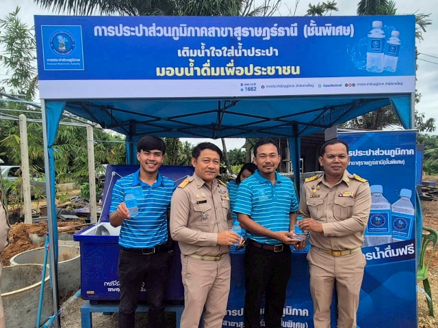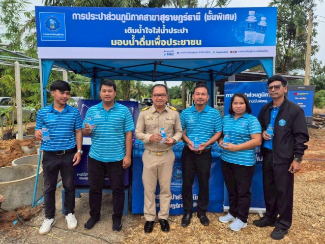 วันที่ 22 ตุลาคม 2568 การประปาส่วนภูมิภาคสาขาสุราษฎร์ธานี(ชั้นพิเศษ) ลงพื้นที่ตั้งบูธบริการน้ำดื่มตราสัญลักษณ์ กปภ. จำนวน 804 ขวด เพื่อบริการผู้เข้าร่วมกิจกรรมในโครงการจัดแสดงผลความสำเร็จการขับเคลื่นงานพัฒนาชุมชน ปี 2568 โดยได้รับเกียรติจากรัฐมนตรีช่วยว่าการกระทรวงมหาดไทย นางสาวศศิธร กิตติธรกุล และคณะลงพื้นที่จังหจัดสุราษฎร์ธานี ณ กลุ่มทอผ้าศรีวิชัย - ทับเที่ยง อำเภอพุนพิน จังหวัดสุราษฎร์ธานี