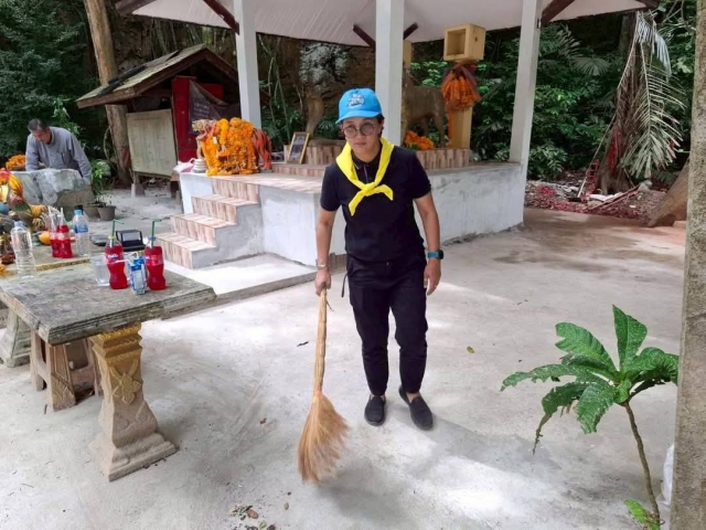 ในการนี้ทีมงานได้ร่วมกันทำความสะอาด และกวาดขยะบริเวณพื้นที่ต่างๆ ของศาล เพื่อให้สถานที่ศักดิ์สิทธิ์แห่งนี้สะอาดและเอื้อต่อการสักการะบูชา