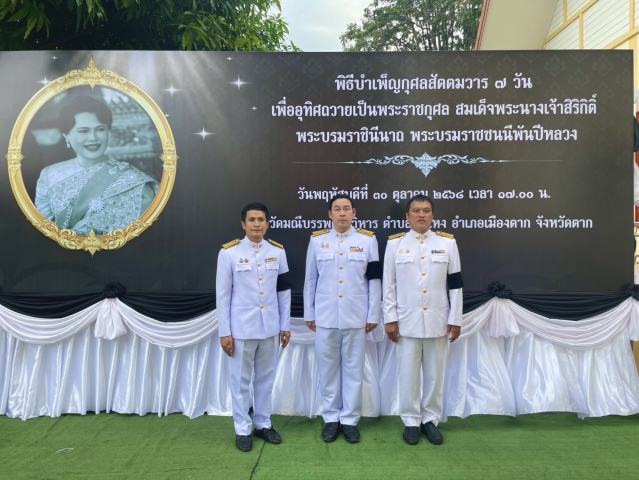 เมื่อวันที่ 30 ตุลาคม 2568 การประปาส่วนภูมิภาคสาขาตากโดย นายวรัตม์ฐนัน ศิริวัฒน์ ผู้จัดการ การประปาส่วนภูมิภาคสาขาตาก พร้อมด้วยพนักงานในสังกัด ร่วมพิธีบำเพ็ญกุศลสัตตมวาร 7 วัน เพื่ออุทิศถวายเป็น พระราชกุศลแด่สมเด็จพระนางเจ้าสิริกิติ์ พระบรมราชินีนาถ พระบรมราชชนนีพันปีหลวง ณ พระอุโบสถวัดมณีบรรพตวรวิหาร ตำบลระแหง อำเภอเมืองตาก จังหวัดตาก โดยมี นายสวนิต สุริยุกุล ณ อยุธยา รองผู้ว่าราชการจังหวัดตาก รักษาราชการแทนผู้ว่าราชการจังหวัดตาก เป็นประธานฝ่ายฆราวาส และมี พระประสิทธิศีลคุณ เจ้าคณะจังหวัดตาก เจ้าอาวาสวัดโคกพลู เป็นประธานฝ่ายสงฆ์ พร้อมทั้งสนับสนุนน้ำดื่มบรรจุขวดตราสัญลักษณ์จำนวน 300 ขวด เพื่อบริการให้แก่ผู้เข้าร่วมพิธีดังกล่าว พร้อมลงนามถวายความอาลัยแด่ สมเด็จพระนางเจ้าสิริกิติ์ พระบรมราชินีนาถ พระบรมราชชนนีพันปีหลวง เพื่อแสดงความจงรักภักดีและสำนึกในพระมหากรุณาธิคุณอันหาที่สุดมิได้