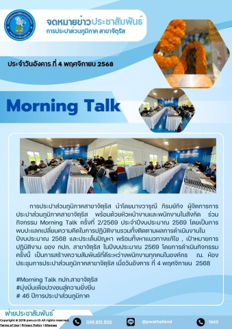การประปาส่วนภูมิภาคสาขาจัตุรัส นำโดยนางวารุณี ภิรมย์กิจ ผู้จัดการการประปาส่วนภูมิภาคสาขาจัตุรัส พร้อมด้วยหัวหน้างานและพนักงานในสังกัด ร่วมกิจกรรม Morning Talk ครั้งที่ 2/2569 ประจำปีงบประมาณ 2569 โดยเป็นการพบปะแลกเปลี่ยนความคิดในการปฏิบัติงานรวมทั้งติดตามผลการดำเนินงานในปีงบประมาณ 2568 และประเด็นปัญหา พร้อมทั้งหาแนวทางแก้ไข , เป้าหมายการปฏิบัติงาน ของ กปภ. สาขาจัตุรัส ในปีงบประมาณ 2569 โดยการดำเนินกิจกรรมครั้งนี้ เป็นการสร้างความสัมพันธ์ที่ดีระหว่างพนักงานทุกคนในองค์กร ณ. ห้องประชุมการประปาส่วนภูมิภาคสาขาจัตุรัส เมื่อวันอังคาร ที่ 4 พฤศจิกายน 2568
