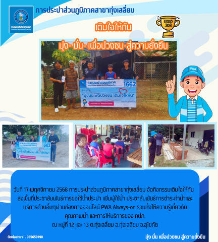 วันที่ 17 พฤศจิกายน 2568 การประปาส่วนภูมิภาคสาขาทุ่งเสลี่ยม จัดกิจกรรมเติมใจให้กัน