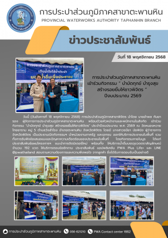 วันนี้ (วันอังคารที่ 18 พฤศจิกายน 2568) การประปาส่วนภูมิภาคสาขาพิจิตร นำโดย นายอำพล กันยารอง ผู้จัดการการประปาส่วนภูมิภาคสาขาตะพานหิน พร้อมด้วยหัวหน้างานและพนักงานในสังกัด เข้าร่วมกิจกรรม "บำบัดทุกข์ บำรุงสุข สร้างรอยยิ้มให้ชาวพิจิตร" ประจำปีงบประมาณ พ.ศ. 2569 ณ วัดหนองหวายไทยยาราม หมู่ 5 ตำบลวังสำโรง อำเภอตะพานหิน จังหวัดพิจิตร โดยมี นางสาวธนียา นัยพินิจ ผู้ว่าราชการจังหวัดพิจิตร เป็นประธานเปิดกิจกรรมฯ นำหน่วยงานภาครัฐ และเอกชน ออกให้บริการประชาชนในพื้นที่ รวมทั้งการรับฟังข้อเสนอแนะและปัญหาความเดือดร้อนของประชาชนในพื้นที่ โดยกิจกรรมภายในบูธ ได้เแก่ ประชาสัมพันธ์แผนโครงการฯ แนะนำการติดมิเตอร์ใหม่ พร้อมทั้ง ให้บริการน้ำดื่มบรรจุขวดตราสัญลักษณ์ จำนวน 192 ขวด ให้บริการตอบข้อซักถาม ประชาสัมพันธ์ แอปพลิเคชัน PWA Plus Life+ และ LINE @pwathailand สอบถามความต้องการและความพึงพอใจ จากลูกค้า ซึ่งได้รับการตอบรับเป็นอย่างดี