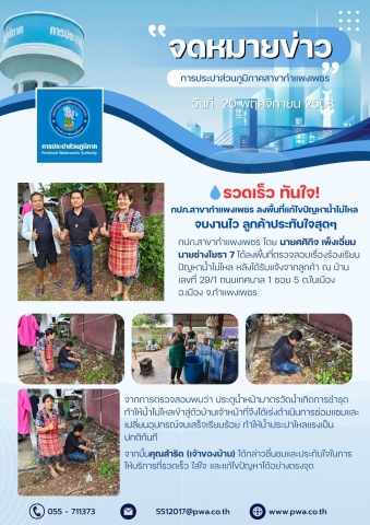 กปภ.สาขากำแพงเพชร โดย นายศศิกิจ เพ็งเอี่ยม นายช่างโยธา 7 ได้ลงพื้นที่ตรวจสอบเรื่องร้องเรียนปัญหาน้ำไม่ไหล หลังได้รับแจ้งจากลูกค้า ณ บ้านเลขที่ 29/1 ถนนเทศบาล 1 ซอย 5 ต.ในเมือง อ.เมือง จ.กำแพงเพชร