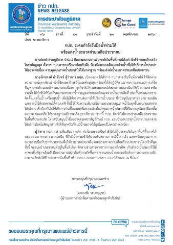 ผู้ว่าการ กปภ.กล่าวเพิ่มเติมว่า กปภ. ห่วงใยและขอเป็นกำลังใจให้ผู้ประสบภัยในทุกพื้นที่ทั้งภาคใต้ ตลอดจนภาคกลาง ภาคเหนือ ที่ยังมีน้ำท่วมขังให้ผ่านพ้นสถานการณ์นี้โดยเร็ว และพร้อมบูรณาการความร่วมมือกับทุกหน่วยงานเพื่อให้สามารถช่วยเหลือและบรรเทาความเดือดร้อนประชาชนโดยเร็วที่สุด ทั้งนี้ ขอแนะนำประชาชนที่อยู่ในพื้นที่เสี่ยง ติดตามข่าวสารจากทางการอย่างใกล้ชิด เก็บสำรองน้ำประปาไว้ใช้ ยกของขึ้นที่สูง พร้อมรับมือสถานการณ์ฉุกเฉินที่อาจเกิดขึ้นหากขาดแคลนน้ำสะอาดหรือต้องการความช่วยเหลือ สามารถติดต่อได้ที่ กปภ.สาขาในพื้นที่ หรือ PWA Contact Center 1662 ได้ตลอด 24 ชั่วโมง