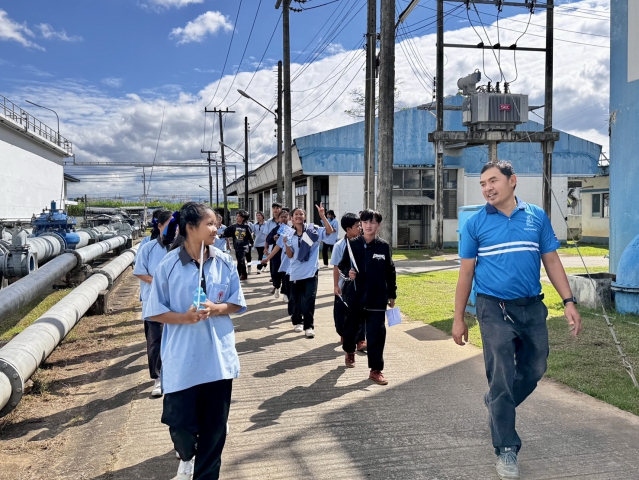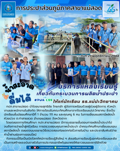 กปภ.สาขาแม่สอด นำโดยนายสุทธิชัย ไทยกล้า ผู้จัดการการประปาส่วนภูมิภาคสาขาแม่สอด พร้อมด้วยผู้ช่วยผู้จัดการ หัวหน้างานและพนักงานในสังกัด ได้เปิดบ้านให้การต้อนรับคณะทัศนศึกษาจากโรงเรียนแม่ปะวิทยาคม ซึ่งเป็นนักเรียนชั้นมัธยมศึกษาปีที่ 1 จำนวน 111 คน และคุณครู 6 คน ในการเยี่ยมชมสถานีผลิตน้ำห้วยม่วง ต.ท่าสายลวด อำเภอแม่สอด จังหวัดตาก