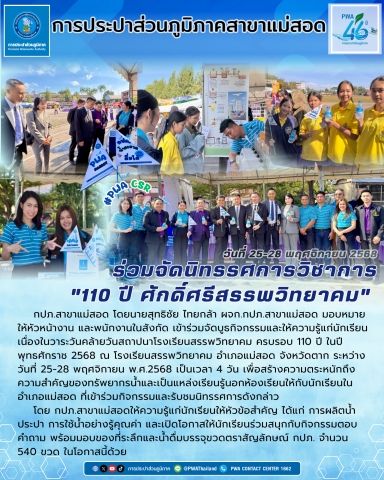 กปภ.สาขาแม่สอด โดยนายสุทธิชัย ไทยกล้า ผจก.กปภ.สาขาแม่สอด มอบหมายให้ หัวหน้างาน และพนักงานในสังกัด เข้าร่วมจัดบูธกิจกรรม และให้ความรู้แก่นักเรียน เนื่องในวาระวันคล้ายวันสถาปนาโรงเรียนสรรพวิทยาคม ครบรอบ 110 ปี ในปีพุทธศักราช 2568 ณ โรงเรียนสรรพวิทยาคม อำเภอแม่สอด จังหวัดตาก ระหว่างวันที่ 25-28 พฤศจิกายน พ.ศ.2568 เป็นเวลา 4 วัน เพื่อสร้างความตระหนักถึงความสำคัญของทรัพยากรน้ำและเป็นแหล่งเรียนรู้นอกห้องเรียนให้กับนักเรียนในอำเภอแม่สอด ที่เข้าร่วมกิจกรรมและรับชมนิทรรศการดังกล่าว
