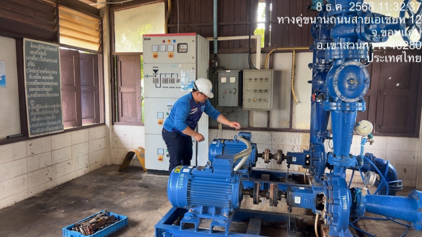 วันจันทร์ ที่ 8 ธันวาคม 2568 โดยนายสุดใจ สนิทนวล ผจก.กปภ.สาขาน้ำพอง นางสาวโสภา สิทธิดำรงค์ ผช.ผจก.กปภ.สาขาน้ำพอง มอบหมายให้ นายกิตติศักดิ์ ธงภักดิ์ หัวหน้างานผลิต พร้อมด้วยพนักงานในสังกัด ดำเนินการเตรียมความพร้อมในการดูแลและให้บริการประชาชนช่วงเทศกาลปีใหม่ประจำปี 2569 ซึ่งเป็นวันหยุดยาวต่อเนื่องในช่วงปีใหม่ โดยดำเนินการบำรุงรักษาเครื่องสูบน้ำแรงสูง บริเวณสถานีจ่ายน้ำเขาสวนกวาง เพื่อรองรับการให้บริการแก่ประชาชนและสามารถผลิตน้ำประปาได้อย่างเพียงพอและจ่ายน้ำได้อย่างทั่วถึง สอดคล้องกับวิสัยทัศน์ มุ่งสู่องค์กรที่เป็นเลิศและยั่งยืนด้านการให้บริการและบริหารจัดการน้ำประปา