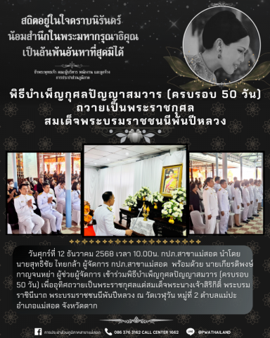 วันศุกร์ที่ 12 ธันวาคม 2568 เวลา 10.00น. กปภ.สาขาแม่สอด นำโดยนายสุทธิชัย ไทยกล้า ผู้จัดการกปภ.สาขาแม่สอด พร้อมด้วย นายเกียรติพงษ์ กาญจนหย่า ผู้ช่วยผู้จัดการ เข้าร่วมพิธีบำเพ็ญกุศลปัญญาสมวาร (ครบรอบ 50 วัน) เพื่ออุทิศถวายเป็นพระราชกุศลแด่สมเด็จพระนางเจ้าสิริกิติ์ พระบรมราชินีนาถ พระบรมราชชนนีพันปีหลวง ณ วัดเวฬุวัน หมู่ที่ 2 ตำบลแม่ปะ อำเภอแม่สอด จังหวัดตาก