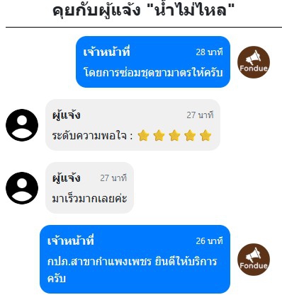 "การแจ้งปัญหาผ่าน Traffy Fondue ทำให้เรามั่นใจว่าเรื่องจะถึง กปภ. และได้รับการแก้ไข รวดเร็วทันใจ มาก ที่สำคัญคือสามารถติดตามสถานะการดำเนินการได้ตลอดเวลา ขอชื่นชมทีมงาน กปภ.สาขากำแพงเพชร ที่ให้บริการได้อย่างรวดเร็วและเป็นมืออาชีพ" ลูกค้ารายดังกล่าว กล่าวด้วยความประทับใจต่อการบริการที่รวดเร็ว