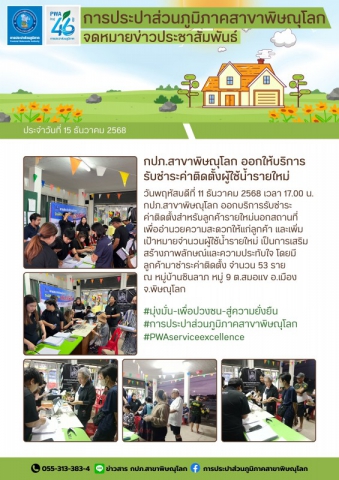 วันพฤหัสบดีที่ 11 ธันวาคม 2568 เวลา 17.00 น. กปภ.สาขาพิษณุโลก นำโดยนางสาวนงนาฎ เนียมสกุล ผู้จัดการ กปภ.สาขาพิษณุโลก มอบหมายให้หัวหน้างานและพนักงานในสังกัด ออกบริการรับชำระค่าติดตั้งสำหรับลูกค้ารายใหม่นอกสถานที่ เพื่ออำนวยความสะดวกให้แก่ลูกค้า และเพิ่มเป้าหมายจำนวนผู้ใช้น้ำรายใหม่ เป็นการเสริมสร้างภาพลักษณ์และความประทับใจ โดยมีลูกค้ามาชำระค่าติดตั้ง จำนวน 53 ราย ณ หมู่บ้านชินลาภ หมู่ 9 ต.สมอแข อ.เมือง จ.พิษณุโลก