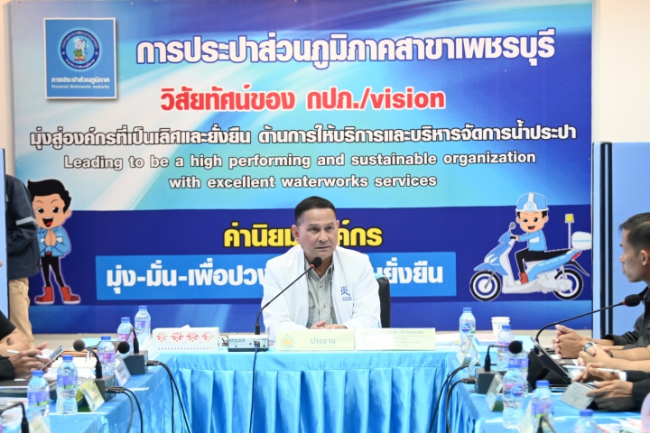 วันพุธที่ 17 ธันวาคม 2568 การประปาส่วนภูมิภาคสาขาเพชรบุรี โดยนายสุชาติ สุดเสนาะ ผู้จัดการการประปาส่วนภูมิภาคสาขาเพชรบุรี พร้อมด้วยนายสัมฤทธิ์ ขลิบสี ผู้ช่วยผู้จัดการฯ และหัวหน้างาน/พนักงานในสังกัด ร่วมประชุมเตรียมการเพื่อสนับสนุนคณะกรรมการลุ่มน้ำเพชรบุรี - ประจวบคีรีขันธ์ ครั้งที่ 3/2568 ณ ห้องประชุมอาคารผลิต การประปาส่วนภูมิภาคสาขาเพชรบุรี ร่วมกับคณะผู้บริหารการประปาส่วนภูมิภาคเขต 3, คณะผู้บริหารสำนักงานทรัพยากรน้ำ, คณะผู้บริหารโครงการส่งน้ำและบำรุงรักษา, ท้องถิ่นจังหวัดเพชรบุรี-ประจวบคีรีขันธ์, และส่วนที่เกี่ยวข้อง โดยมีนายณัฐวุฒิ เพ็ชรพรหมศร ผู้ทรงคุณวุฒิ คณะกรรมการลุ่มน้ำเพชรบุรี - ประจวบคีรีขันธ์ เป็นประธานเปิดการประชุม ตามแผนขับเคลื่อนน้ำสะอาดเพื่อการอุปโภคบริโภค (พ.ศ.2566-2580) โดยทุกหมู่บ้านทั่วประเทศและชุมชนเมืองมีน้ำสะอาดใช้เพื่อการอุปโภคบริโภคเพียงพอ รวม 4 กลยุทธ์ได้แก่ กลยุทธ์ที่ 1 บำรุงรักษาและซ่อมแซมระบบประปา กลยุทธ์ที่ 2 พัฒนา ขยายเขตระบบประปา เพิ่มประสิทธิภาพประปา และเพิ่มปริมาณน้ำต้นทุน กลยุทธ์ที่ 3 ติดตาม ตรวจสอบคุณภาพน้ำอุปโภคบริโภคให้ได้มาตรฐาน และกลยุทธ์ที่ 4 บริหารจัดการ รวมทั้งกำหนดค่าเป้าหมายและตัวชี้วัดของแต่ละกลยุทธ์ พร้อมทั้งลงพื้นที่เยี่ยมชมสถานีบริการน้ำดื่มสะอาด Mini Station,โรงกรองน้ำ, ห้องควบคุมระบบผลิตน้ำประปา (SCADA Control Room) และห้องปฏิบัติการวิทยาศาสตร์ (LAB CLUSTER)