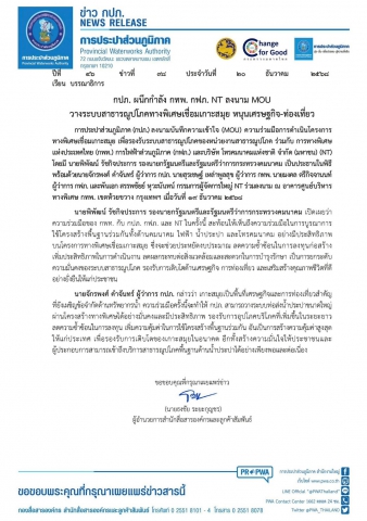 การประปาส่วนภูมิภาค (กปภ.) ลงนามบันทึกความเข้าใจ (MOU) ความร่วมมือการดำเนินโครงการทางพิเศษเชื่อมเกาะสมุย เพื่อรองรับระบบสาธารณูปโภคของหน่วยงานสาธารณูปโภค ร่วมกับ การทางพิเศษแห่งประเทศไทย (กพท.) การไฟฟ้าส่วนภูมิภาค (กฟภ.) และบริษัท โทรคมนาคมแห่งชาติ จำกัด (มหาชน) (NT) โดยมี นายพิพัฒน์ รัชกิจประการ รองนายกรัฐมนตรีและรัฐมนตรีว่าการกระทรวงคมนาคม เป็นประธานในพิธี พร้อมด้วยนายจักรพงศ์ คำจันทร์ ผู้ว่าการ กปภ. นายสุรเชษฐ์ เหล่าพูลสุข ผู้ว่าการ กทพ. นายมงคล ตรีกิจจานนท์ ผู้ว่าการ กฟภ. และพันเอก สรรพชัยย์ หุวะนันทน์ กรรมการผู้จัดการใหญ่ NT ร่วมลงนาม ณ อาคารศูนย์บริหารทางพิเศษ กทพ. เขตห้วยขวาง กรุงเทพฯ เมื่อวันที่ 19 ธันวาคม 2568 นายพิพัฒน์ รัชกิจประการ รองนายกรัฐมนตรีและรัฐมนตรีว่าการกระทรวงคมนาคม เปิดเผยว่า ความร่วมมือของ กพท. กับ กปภ. กฟภ. และ NT ในครั้งนี้ สะท้อนให้เห็นถึงความร่วมมือในการบูรณาการ ใช้โครงสร้างพื้นฐานร่วมกันทั้งด้านคมนาคม ไฟฟ้า น้ำประปา และโทรคมนาคม อย่างมีประสิทธิภาพ บนโครงการทางพิเศษเชื่อมเกาะสมุย ซึ่งจะช่วยประหยัดงบประมาณ ลดความซ้ำซ้อนในการลงทุนก่อสร้าง เพิ่มประสิทธิภาพในการดำเนินงาน ลดผลกระทบต่อสิ่งแวดล้อมและสะดวกในการบำรุงรักษา เป็นการยกระดับความมั่นคงของระบบสาธารณูปโภค รองรับการเติบโตด้านเศรษฐกิจ การท่องเที่ยว และเสริมสร้างคุณภาพชีวิตที่ดีอย่างยั่งยืนให้แก่ประชาชน นายจักรพงศ์ คำจันทร์ ผู้ว่าการ กปภ. กล่าวว่า เกาะสมุยเป็นพื้นที่เศรษฐกิจและการท่องเที่ยวสำคัญที่ยังเผชิญข้อจำกัดด้านทรัพยากรน้ำ ความร่วมมือครั้งนี้จะทำให้ กปภ. สามารถวางระบบท่อส่งน้ำประปาขนาดใหญ่ผ่านโครงสร้างทางพิเศษได้อย่างมั่นคงและมีประสิทธิภาพ รองรับการอุปโภคบริโภคที่เพิ่มขึ้นในระยะยาวลดความซ้ำซ้อนในการลงทุน เพิ่มความคุ้มค่าในการใช้โครงสร้างพื้นฐานร่วมกัน อันเป็นการสร้างความคุ้มค่าสูงสุดให้แก่ประเทศ เพื่อรองรับการเติบโตของเกาะสมุยในอนาคต อีกทั้งสร้างความมั่นใจให้ประชาชนและผู้ประกอบการสามารถเข้าถึงบริการสาธารณูปโภคพื้นฐานด้านน้ำประปาได้อย่างเพียงพอและต่อเนื่อง