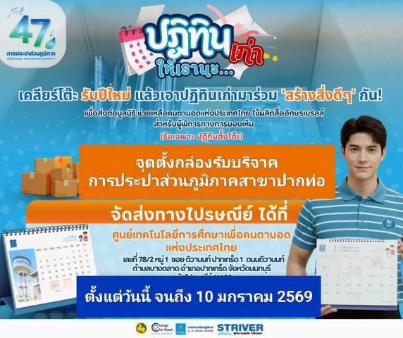 การประปาส่วนภูมิภาค (กปภ.) ขอเชิญชวนลูกค้า ประชาชน หน่วยงานภาครัฐและเอกชน ร่วมเป็นส่วนหนึ่งในการส่งต่อคุณค่าและโอกาสทางการศึกษา ผ่านโครงการ "ปฏิทินเก่า ให้เรานะ ปี 2569" ด้วยการนำปฏิทินตั้งโต๊ะที่ไม่ใช้แล้วแต่ยังอยู่ในสภาพดีมาร่วมบริจาค เพื่อนำไปส่งมอบให้แก่มูลนิธิช่วยคนตาบอดแห่งประเทศไทย ในพระบรมราชินูปถัมภ์ นำไปผลิตเป็นสื่อการเรียนการสอนอักษรเบรลล์สำหรับผู้พิการทางสายตาต่อไป โครงการปฏิทินเก่าให้เรานะ เป็นกิจกรรมความรับผิดชอบต่อสังคม (CSR) ที่ กปภ. ดำเนินการเพื่อสะท้อนบทบาทขององค์กรในการมีส่วนร่วมพัฒนาสังคมและดูแลสิ่งแวดล้อมอย่างยั่งยืน โดยมุ่งส่งเสริมจิตสาธารณะ ควบคู่กับการปลูกฝัง DNA จิตอาสาให้แก่พนักงาน กปภ. ทั้งนี้ สามารถติดต่อสอบถามข้อมูลเพิ่มเติมได้ที่ PWA Contact Center 1662 ตลอด 24 ชั่วโมง