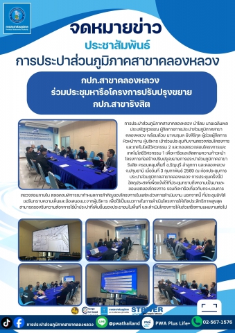 การประปาส่วนภูมิภาคสาขาคลองหลวง นำโดย นายเฉลิมพล ประเสริฐสุวรรณ ผู้จัดการการประปาส่วนภูมิภาคสาขาคลองหลวง พร้อมด้วย นางนฤมล ยังสิริกุล ผู้ช่วยผู้จัดการ หัวหน้างาน ผู้บริหาร เข้าร่วมประชุมกับงานตรวจสอบโครงการและเทคโนโลยีวิศวกรรม 2 และกองตรวจสอบโครงการและเทคโนโลยีวิศวกรรม 1 เพื่อหารือและติดตามความก้าวหน้าโครงการก่อสร้างปรับปรุงขยายการประปาส่วนภูมิภาคสาขารังสิต ครอบคลุมพื้นที่ อ.ธัญบุรี ลำลูกกา และคลองหลวง จ.ปทุมธานี เมื่อวันที่ 3 กุมภาพันธ์ 2569 ณ ห้องประชุมการประปาส่วนภูมิภาคสาขาคลองหลวง การประชุมครั้งนี้มีวัตถุประสงค์เพื่อแจ้งให้ที่ประชุมทราบถึงความเป็นมาและขอบเขตของโครงการ รวมถึงหารือเกี่ยวกับกระบวนการตรวจสอบภายใน ตลอดจนพิจารณากำหนดการสำคัญของโครงการในแต่ละช่วงการดำเนินงาน นอกจากนี้ ที่ประชุมยังได้ขอรับทราบความเห็นและข้อเสนอแนะจากผู้บริหาร เพื่อใช้เป็นแนวทางในการดำเนินโครงการให้เกิดประสิทธิภาพสูงสุด สามารถรองรับความต้องการใช้น้ำประปาที่เพิ่มขึ้นของประชาชนในพื้นที่ และดำเนินโครงการให้แล้วเสร็จตามแผนงานต่อไป