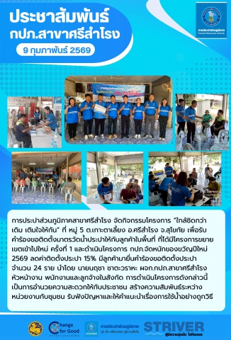 การประปาส่วนภูมิภาคสาขาศรีสำโรง จัดกิจกรรมโครงการ "ใกล้ชิดกว่าเดิม เติมใจให้กัน" ที่ หมู่ 5 ต.เกาะตาเลี้ยง อ.ศรีสำโรง จ.สุโขทัย เพื่อรับ คำร้องขอติดตั้งมาตรวัดน้ำประปาให้กับลูกค้าในพื้นที่ ที่ได้มีโครงการขยายเขตเข้าไปใหม่ ครั้งที่ 1 และดำเนินโครงการ กปภ.จัดหนักของขวัญปีใหม่ 2569 ลดค่าติดตั้งประปา 15% มีลูกค้ามายื่นคำร้องขอติดตั้งประปา จำนวน 24 ราย นำโดย นายนฤชา ชาตะวราหะ ผจก.กปภ.สาขาศรีสำโรง หัวหน้างาน พนักงานและลูกจ้างในสังกัด การดำเนินโครงการดังกล่าวนี้เป็นการอำนวยความสะดวกให้กับประชาชน สร้างความสัมพันธ์ระหว่างหน่วยงานกับชุมชน รับฟังปัญหาและให้คำแนะนำเรื่องการใช้น้ำอย่างถูกวิธี