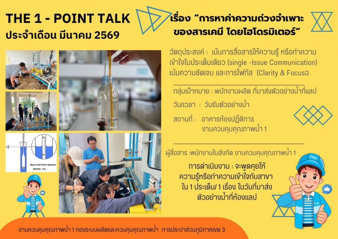 สำหรับกิจกรรม THE 1 - POINT TALK จะเน้นการสื่อสารให้ความรู้ทำความเข้าใจในประเด็นเดียว (single-Issue Communication) ความชัดเจน และการโฟกัส (Clarity & Focus) โดยจัดขึ้น ณ อาคารห้องปฏิบัติการ งานควบคุมคุณภาพน้ำ 1 กองระบบผลิตและควบคุมคุณภาพน้ำ การประปาส่วนภูมิภาคเขต 3 เพื่อ กปภ.สาขากาญจนบุรี สามารถนำความรู้จากกิจกรรมครั้งนี้ เพิ่มประสิทธิภาพในการผลิตน้ำประปาให้ได้ตามมาตรฐาน กปภ. นอกจากนี้ กปภ.สาขากาญจนบุรีและงานควบคุมคุณภาพน้ำ 1 ได้มีโครงการอนุรักษ์สิ่งแวดล้อม โดยเปลี่ยนการใช้ถุงลำเลียงขวดตัวอย่างน้ำ มาเป็นตะกร้า ซึ่งสามารถนำกลับมาใช้งานซ้ำ ลดขยะ ลดมลพิษ เพื่อการอนุรักษ์สิ่งแวดล้อมที่ยั่งยืน