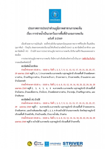 ⏰ เปิดจ่ายน้ำช่วงเวลา : 05.00 - 18.00 น. (สลับวันเว้นวัน)