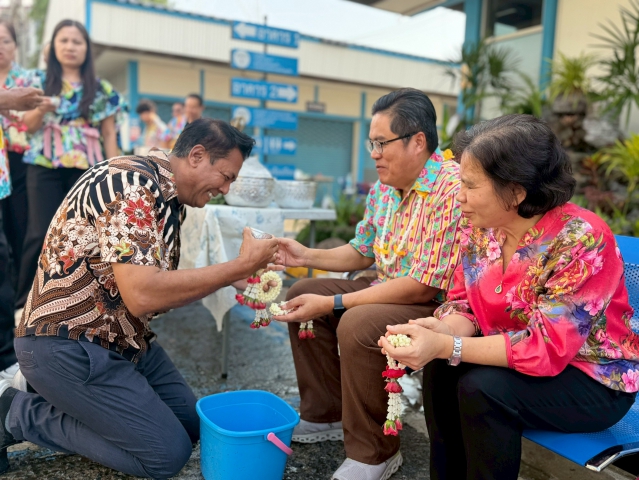 พิธีรดน้ำดำหัว: พนักงานร่วมกันรดน้ำขอพรจาก นายภวัต แผลงศรี ผู้จัดการ กปภ.สาขาฯ และพนักงานอาวุโสที่เคารพรัก เพื่อแสดงความกตัญญูกตเวทีตามธรรมเนียมไทยที่ปฏิบัติสืบต่อกันมา