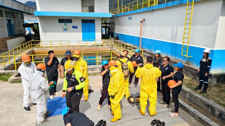 พร้อมกันนี้ ได้จำลองเหตุสถานการณ์ภาวะฉุกเฉินสารเคมีรั่วไหล ณ บริเวณโรงกรองน้ำแม่ข่าย สำนักงาน กปภ.สาขาระนอง เพื่อเตรียมความพร้อมให้พนักงานในการรับมือ กรณีเกิดเหตุสารเคมีรั่วไหลได้อย่างปลอดภัยและทันท่วงที เพื่อลดการสูญเสียในชีวิตและทรัพย์สินขององค์กร และลูกค้าที่เข้ารับบริการด้วย เมื่อวันที่ 24 เมษายน ที่ผ่านมา