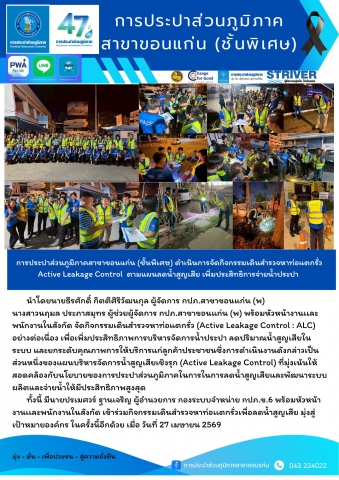 การประปาส่วนภูมิภาคสาขาขอนแก่น (ชั้นพิเศษ) ดำเนินการจัดกิจกรรมเดินสำรวจหาท่อแตกรั่วActive Leakage Control ตามแผนลดน้ำสูญเสีย เพิ่มประสิทธิการจ่ายน้ำประปา