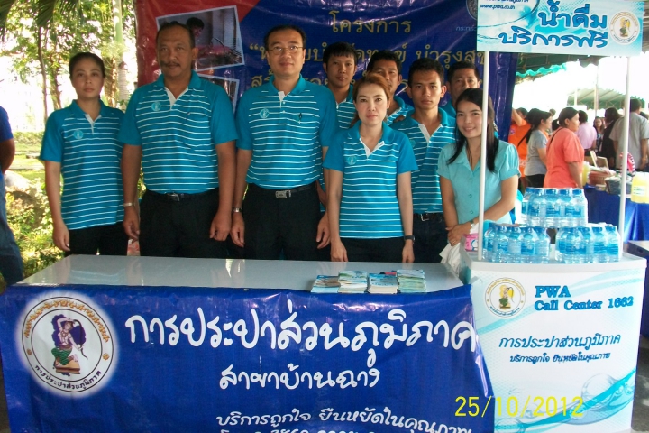 การประปาส่วนภูมิภาคสาขาบ้านฉาง นำโดย นายเจษฎา ชูชาญ ผู้จัดการ กปภ.สาขาบ้านฉาง ,นายสุวิช แสงแข ผช.ผจก.กปภ.สาขาบ้านฉาง, นายธีรทัศน์ กลองชิต หนง.ผลิต , นายดนัย เอกวิริยกิจ หนง.อำนวยการ, นายสยาม ปานศิริ รก.หนง.บริการฯ พนักงานและลูกจ้างในสังกัด ร่วมออกหน่วย บำบัดทุกข์ บำรุงสุข สร้างรอยยิ้มให้ประชาชน จังหวัดระยอง ครั้งที่ ๑/๒๕๕๖ ณ เทศบาลตำบลบ้านฉาง อ.บ้านฉาง จ.ระยอง วันที่ ๒๕ ตุลาคม ๒๕๕๕ เวลา ๐๘.๓๐ – ๑๒.๐๐ น. ให้บริการประชาชนในลักษณะบริการเคลื่อนที่ เพื่อความสะดวก รวดเร็ว และเป็นการประหยัดค่าใช้จ่ายในการเดินทาง มีบริการติดต่อสอบถามเรื่องระบบประปา, แจ้งเรื่องร้องเรียน,แจกแผ่นพับประชาสัมพันธ์ กปภ. และน้ำดื่มบรรจุขวด จำนวน ๑๐๐ โหล ซึ่งมีประชาชนสนใจใช้บริการจำนวน ๒๕๐ ราย