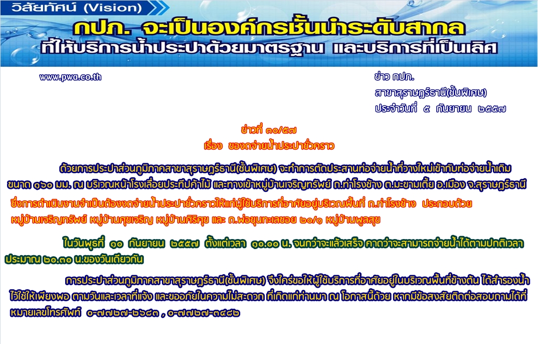 ประกาศ การประปาส่วนภูมิภาคสาขาสุราษฎร์ธานี(ชั้นพิเศษ) เรื่อง ของดจ่ายน้ำประปาชั่วคราว