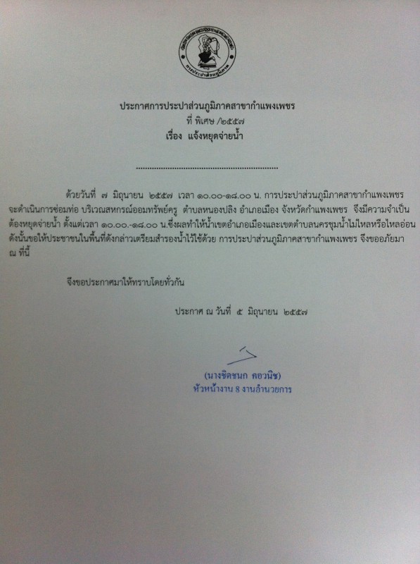 ๒๖ พ.ค. ๕๗ กปภ.สาขาลำปางแจ้งหยุดจ่ายน้ำตั้งแต่เวลา ๒๔.๐๐ เพื่อตัดประสานท่อจ่ายน้ำ ณ สำนักงาน กปภ.สาขาลำปาง