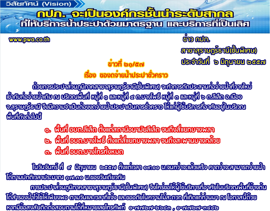 การประปาส่วนภูมิภาคสาขาสุราษฎร์ธานี(ชั้นพิเศษ) ของดจ่ายน้ำประปาชั่วคราว