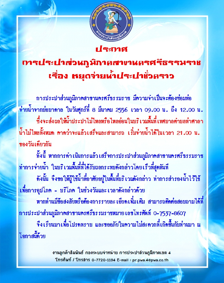 ประกาศ การประปาส่วนภูมิภาคสาขานครศรีธรรมราช เรื่อง หยุดจ่ายน้ำประปาชั่วคราว