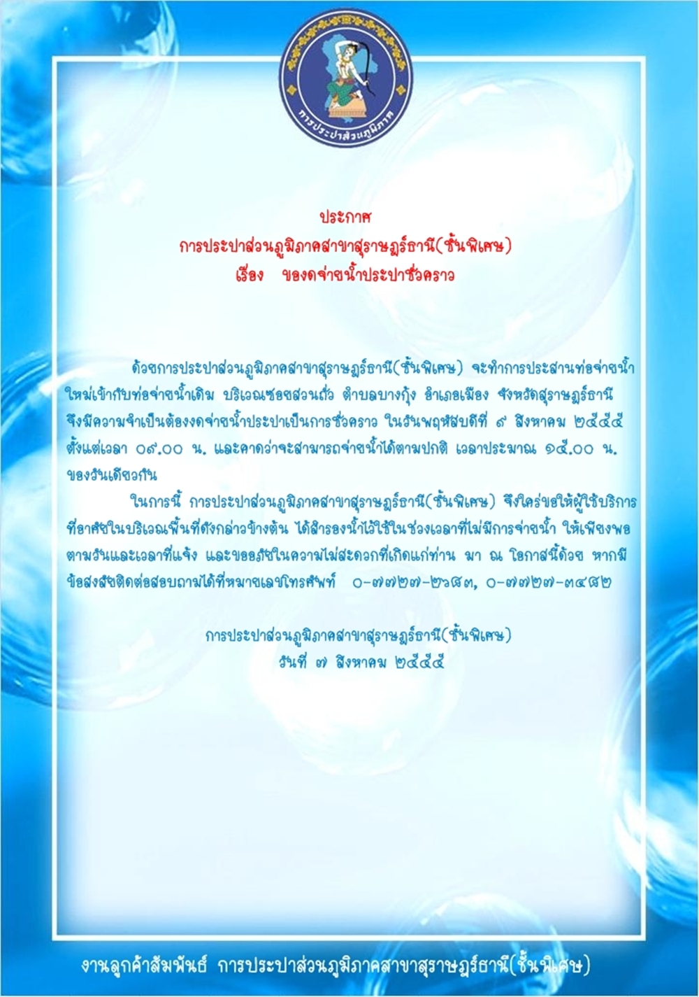 ประกาศ การประปาส่วนภูมิภาคสาขาสุราษฎร์ธานี(ชั้นพิเศษ) ของดจ่ายน้ำประปาชั่วคราว